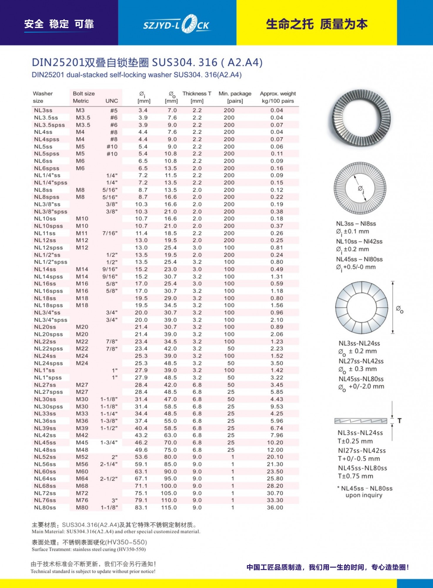 制造工藝:DIN25201標(biāo)準(zhǔn)墊圈全部使用SUS304.316或相應(yīng)等級(jí)的A2.A4不銹鋼材質(zhì)、經(jīng)硬化處理后表面硬在HV350-520之間、硬化層度為20MU、硬度等級(jí)10級(jí)!墊圈的可適用于800度高溫及-160度低溫環(huán)境!