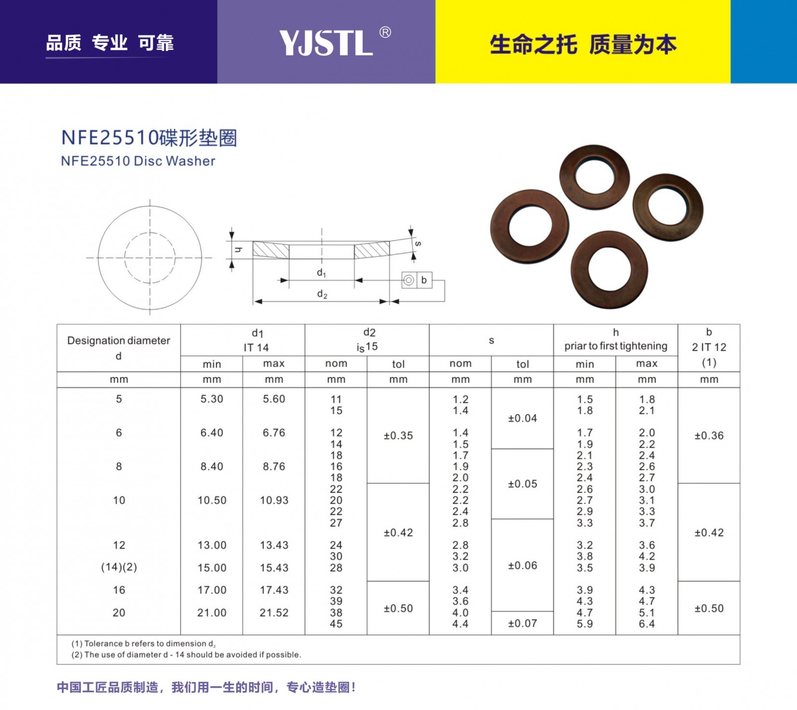 制造執(zhí)行標準:符合NFE25510與DIN6796-HS標準。規(guī)格:M5-M20型號,也可提供訂制服務主要材質(zhì)有S60C,60Si2mn,51crav4及特殊合金材質(zhì),鹽浴硬化,表面處理為磷化黑,機械鋅,達克羅涂層等!不提供化學電鍍處理!多數(shù)情況下標準型碟形彈簧墊圈并不能完全滿足用戶要求,通過計算與適當調(diào)整來獲得理想的訂制功能!