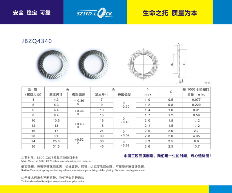 JBZQ4340防松墊圈、執(zhí)行中國(guó)機(jī)械標(biāo)準(zhǔn)、通常配合8.8級(jí)以上螺栓使用!技術(shù)成熟、性能穩(wěn)定、性價(jià)比高正在被越來(lái)越多的工業(yè)裝備領(lǐng)域大量使用!