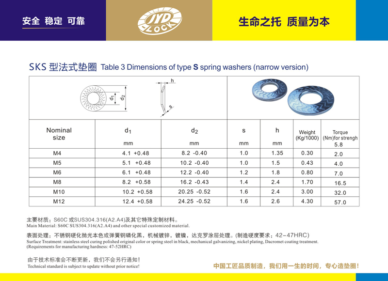 執(zhí)行標(biāo)準(zhǔn):按SKS鎖緊墊圈制造規(guī)格:M4-M30為標(biāo)準(zhǔn)型號(hào) 也可按要求求提供訂制。主要鋼質(zhì):SUS304.316、A2.A4及超級(jí)不銹鋼等 硬化等級(jí):HV350 符合10