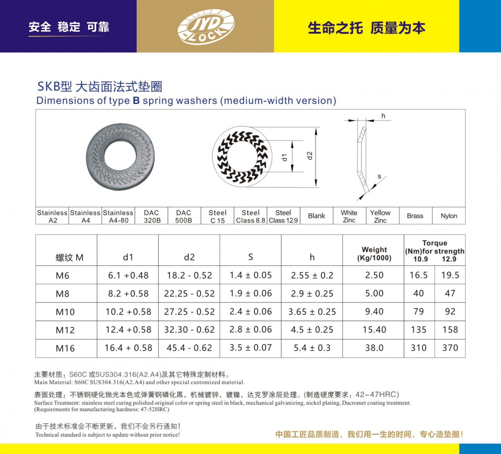 SKB墊圈使用:B型鎖緊墊圈為加寬設(shè)計(jì)、使用于頭部接觸面較大的螺栓、接觸越大預(yù)緊力及鎖緊效果越好!
