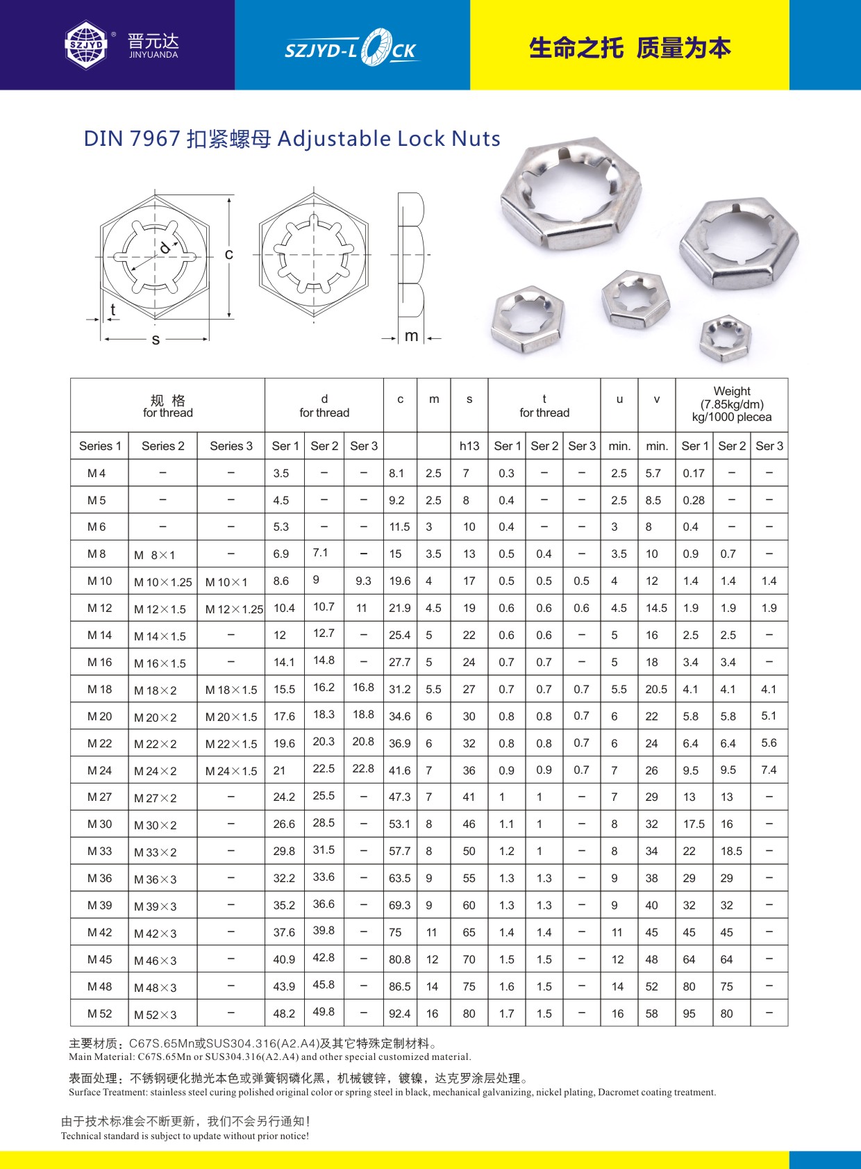 德國標準DIN7967扣緊螺母,SUS304/SUS316不銹鋼扣緊螺母/等換EN1.4401/EN1.4301不銹鋼扣緊螺母/級進模沖壓生產(chǎn)工藝,為了保證扣緊螺母的鎖緊性能,SZJYD品牌扣緊螺母的不銹鋼材質(zhì)都在進行彈性硬化處理!