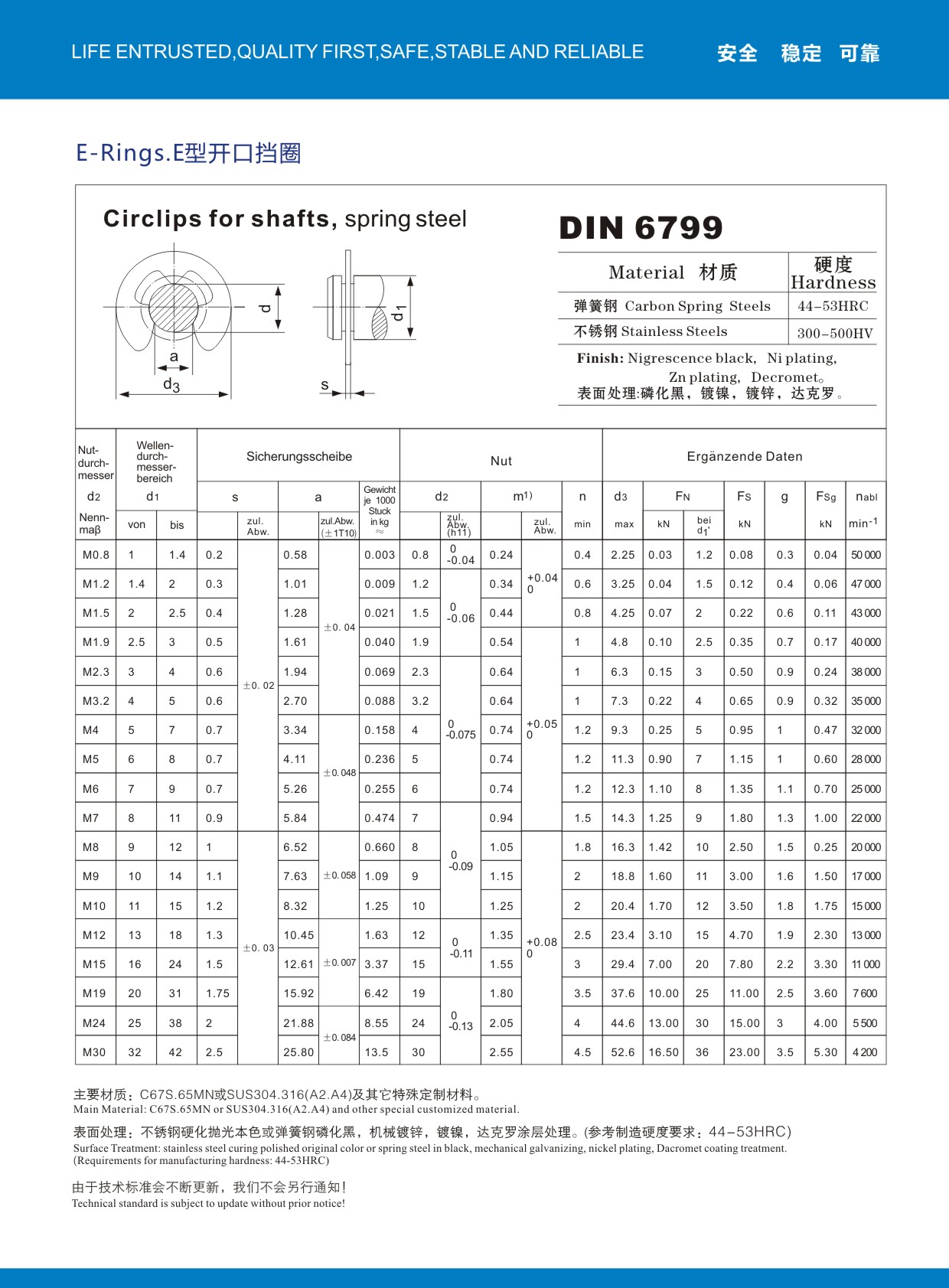 德國(guó)標(biāo)準(zhǔn)DIN6799開口擋圈,使用65MN,C67S彈簧鋼材質(zhì)及SUS304.SUS316/EN1.4301.EN1.4401不銹鋼材質(zhì),硬化質(zhì)量穩(wěn)定,回彈性好!彈簧鋼表面磷化黑,機(jī)械鋅等!鹽霧可達(dá)500H以上,保證無(wú)氫脆斷裂!瑞士模具制造設(shè)備,可生產(chǎn)0.8微精密開口擋圈,史特牢公司級(jí)進(jìn)模具生產(chǎn)高效率低成本!