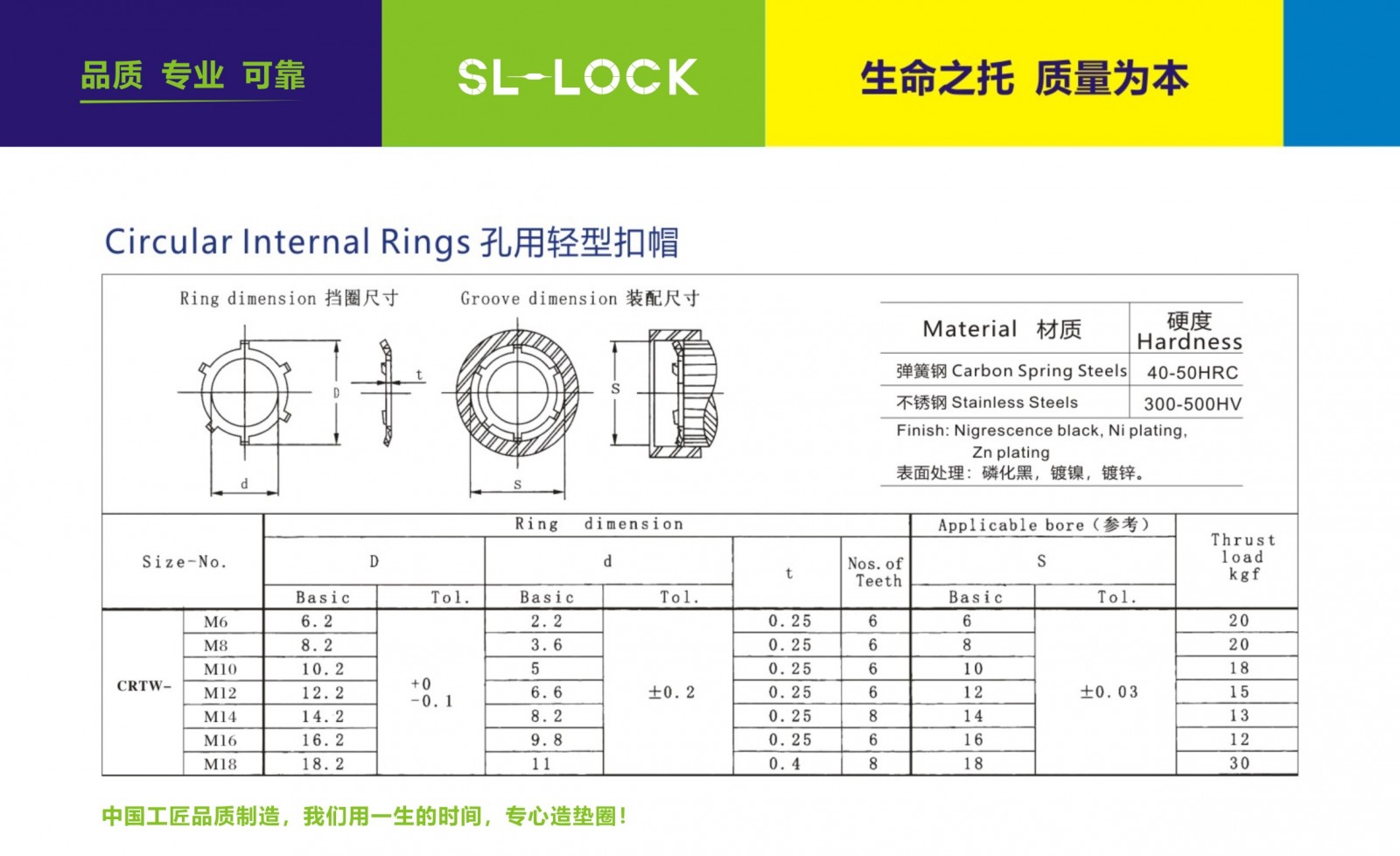 名稱(chēng):輕型孔用止動(dòng)墊圈 執(zhí)行標(biāo)準(zhǔn):CRTW 型號(hào):M6-M18 材質(zhì):SUS301/SUS304/SUS316 表面處理:硬化拋光