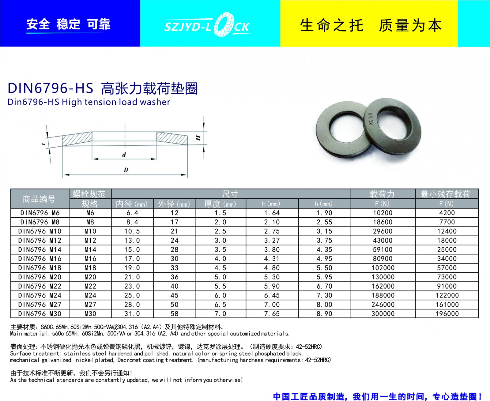 制造執(zhí)行標(biāo)準(zhǔn):符合DIN6796-HS標(biāo)準(zhǔn)。規(guī)格:M6-M30型號,也可提供訂制服務(wù)主要材質(zhì)有S60C,60Si2mn,51crav4及SUS304\SUS316特殊合金等,經(jīng)等溫精細(xì)硬后進(jìn)行磷化黑,機(jī)械鋅,鋅鋁涂層表面處理等!安全墊圈不適宜化學(xué)表面處理!多數(shù)標(biāo)準(zhǔn)型碟形彈簧墊圈有時并不能完全滿足設(shè)計(jì)要求,通過計(jì)算與調(diào)整訂制來獲得理想安全功能!