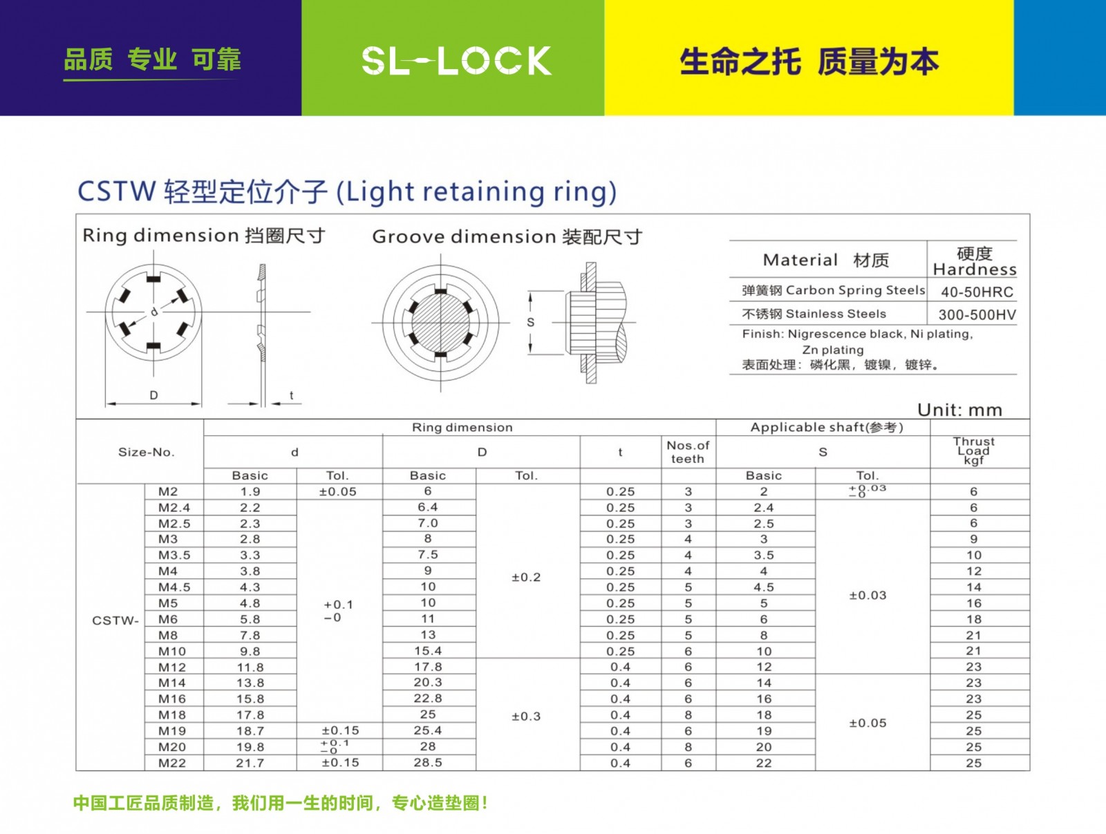 名稱:輕型孔用止動墊圈 執(zhí)行標(biāo)準(zhǔn):CRTW 型號:M2-M22 材質(zhì):65MN/C67S 表面處理:磷化黑色